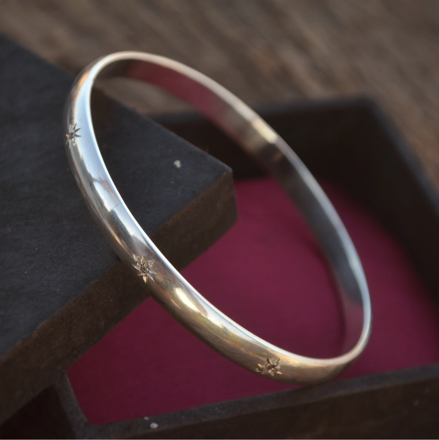 This elegant sterling silver kada features a sleek, polished band adorned with delicate starburst engravings. Inspired by the quiet beauty of the night sky, its minimalist design offers a refined sparkle that’s both subtle and timeless—perfect for everyday wear or layering with other pieces for a graceful, modern look.