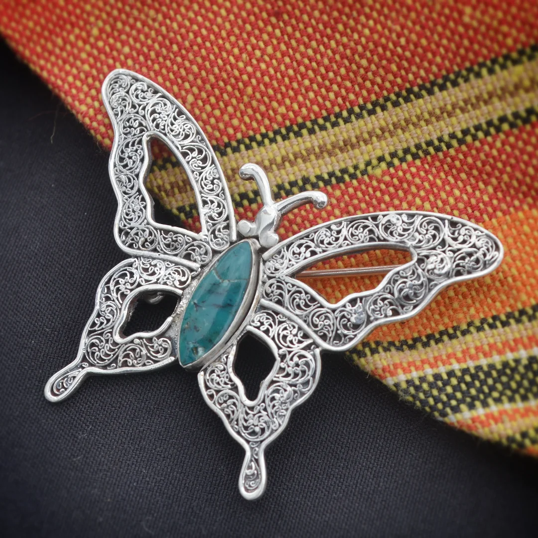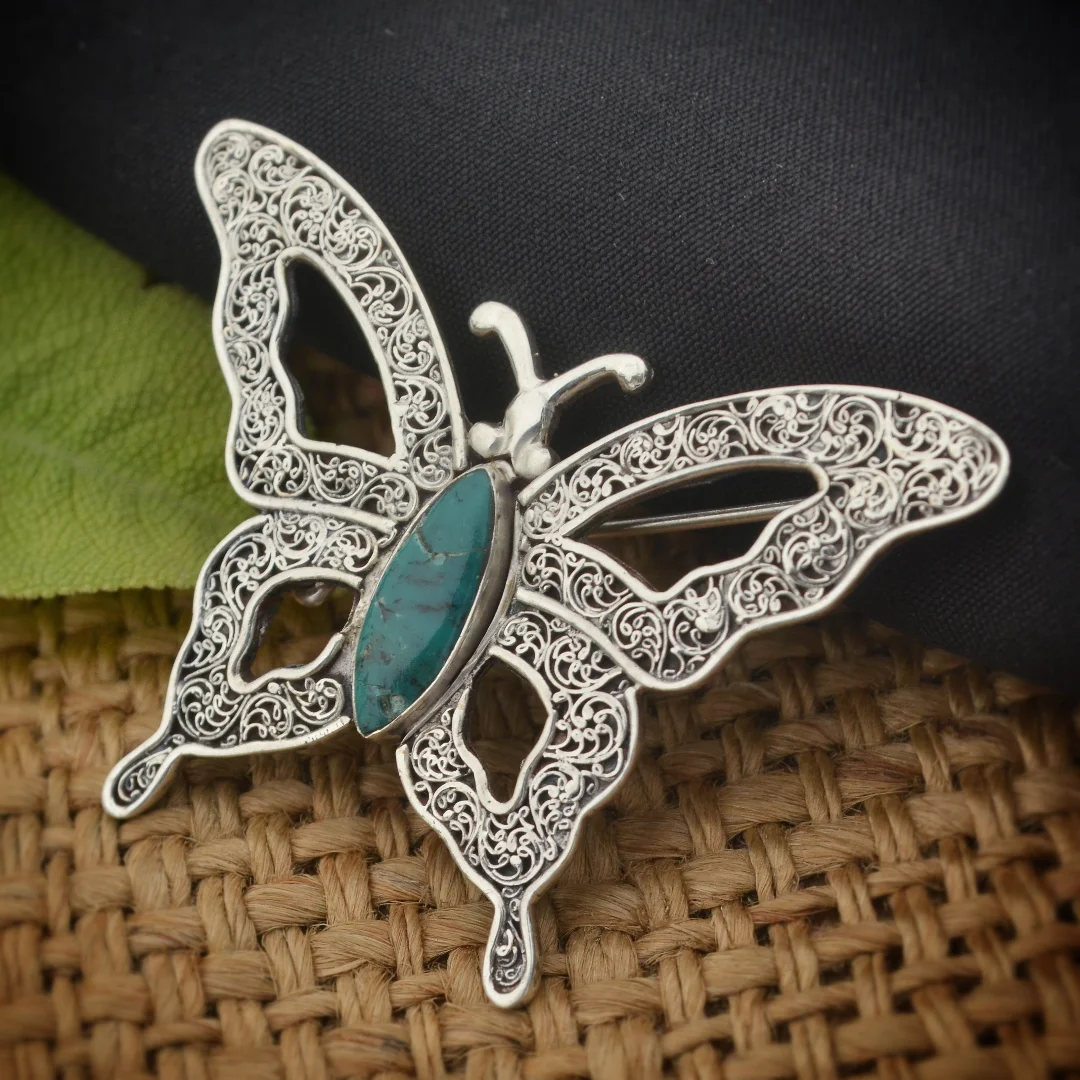 This is a beautiful piece of jewelry combining traditional Newari filigree technique. Butterflies are usually symbolized with transformation. Their life cycle—from caterpillar to chrysalis to butterfly—mirrors the journey of personal growth, overcoming challenges, and emerging with newfound beauty. Just as a butterfly's beauty unfolds after a period of darkness, so too can our lives become more meaningful and fulfilling after going through difficult times. The turquoise gemstone, often associated with protection, wisdom, and communication, is set in the center body of the butterfly, adding a touch of vibrant color and beauty to it.