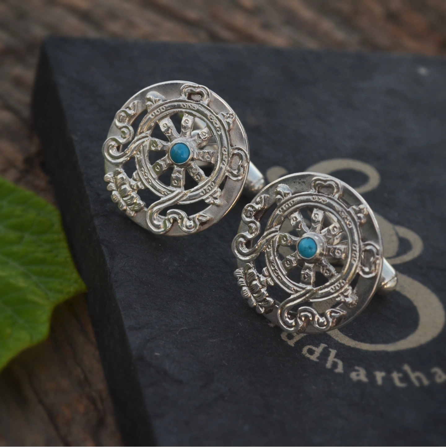 A refined pair of handcrafted silver cufflinks featuring the sacred Dharma Wheel motif, symbolizing wisdom, guidance, and the path to enlightenment. Accented with a subtle turquoise stone at the center and surrounded by elegant traditional scrollwork, these cufflinks blend spiritual depth with timeless sophistication—perfect for formal wear with a meaningful touch.