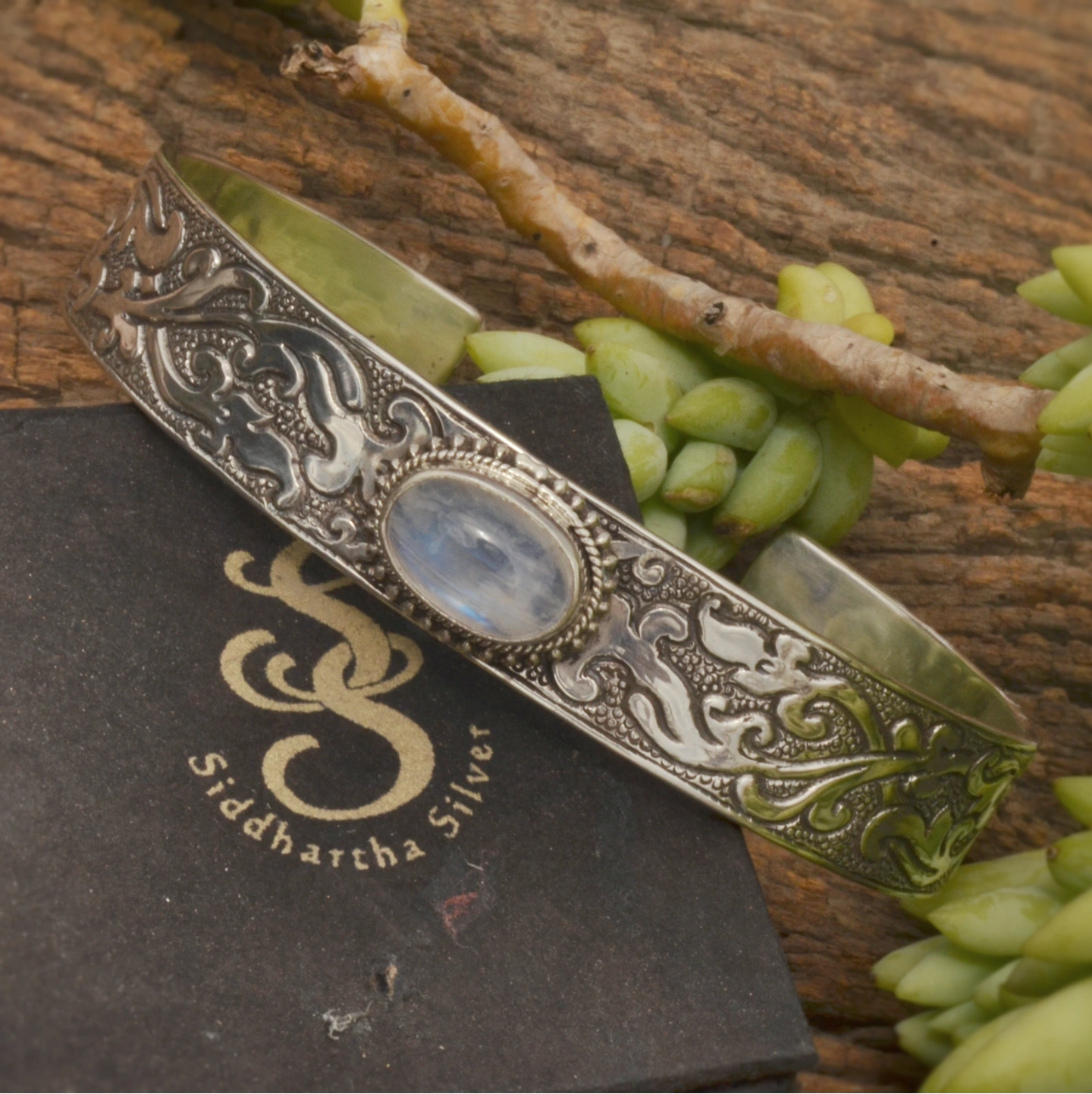 Elevate your style with this handcrafted sterling silver cuff, adorned with an elegant oval moonstone at its center. Detailed with intricate traditional patterns, this timeless piece reflects artistry and grace. Perfect for everyday elegance or special occasions, it brings a touch of serenity, sophistication, and charm to your jewelry collection.