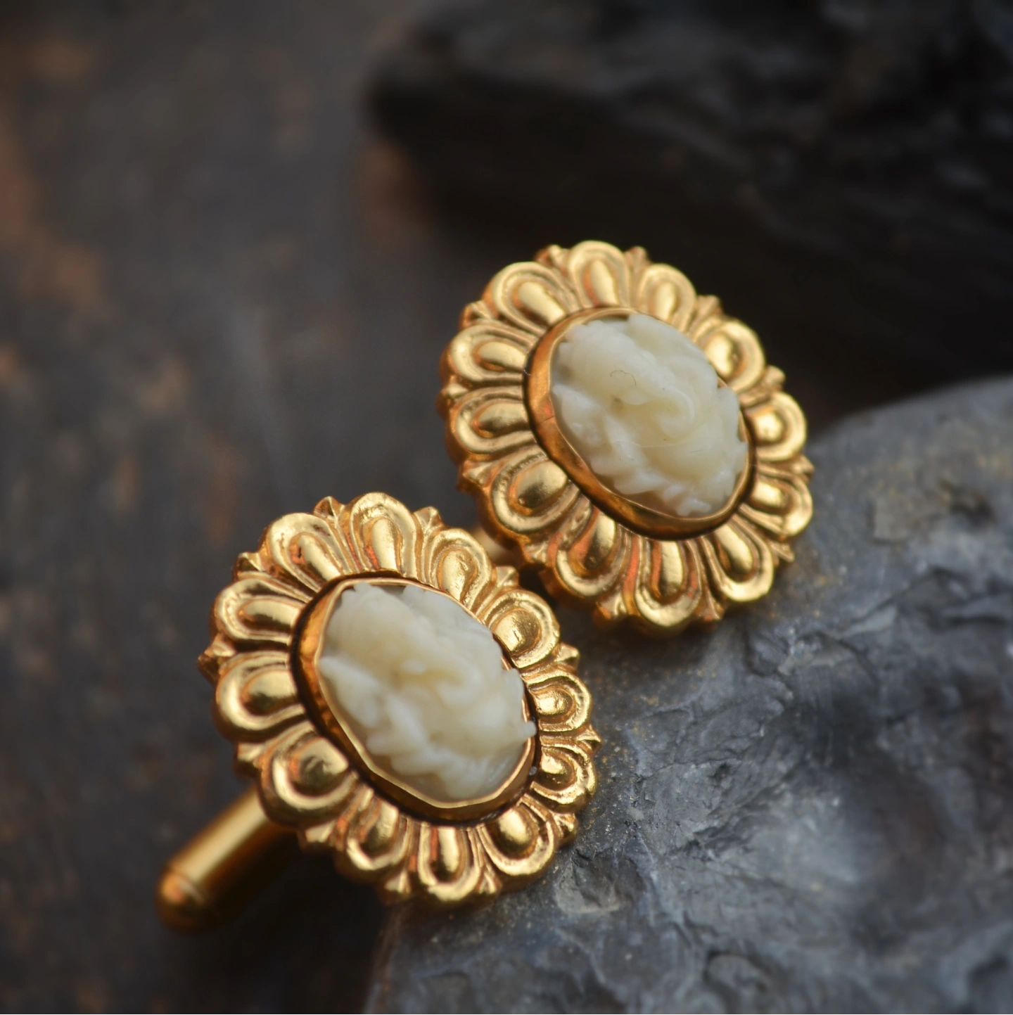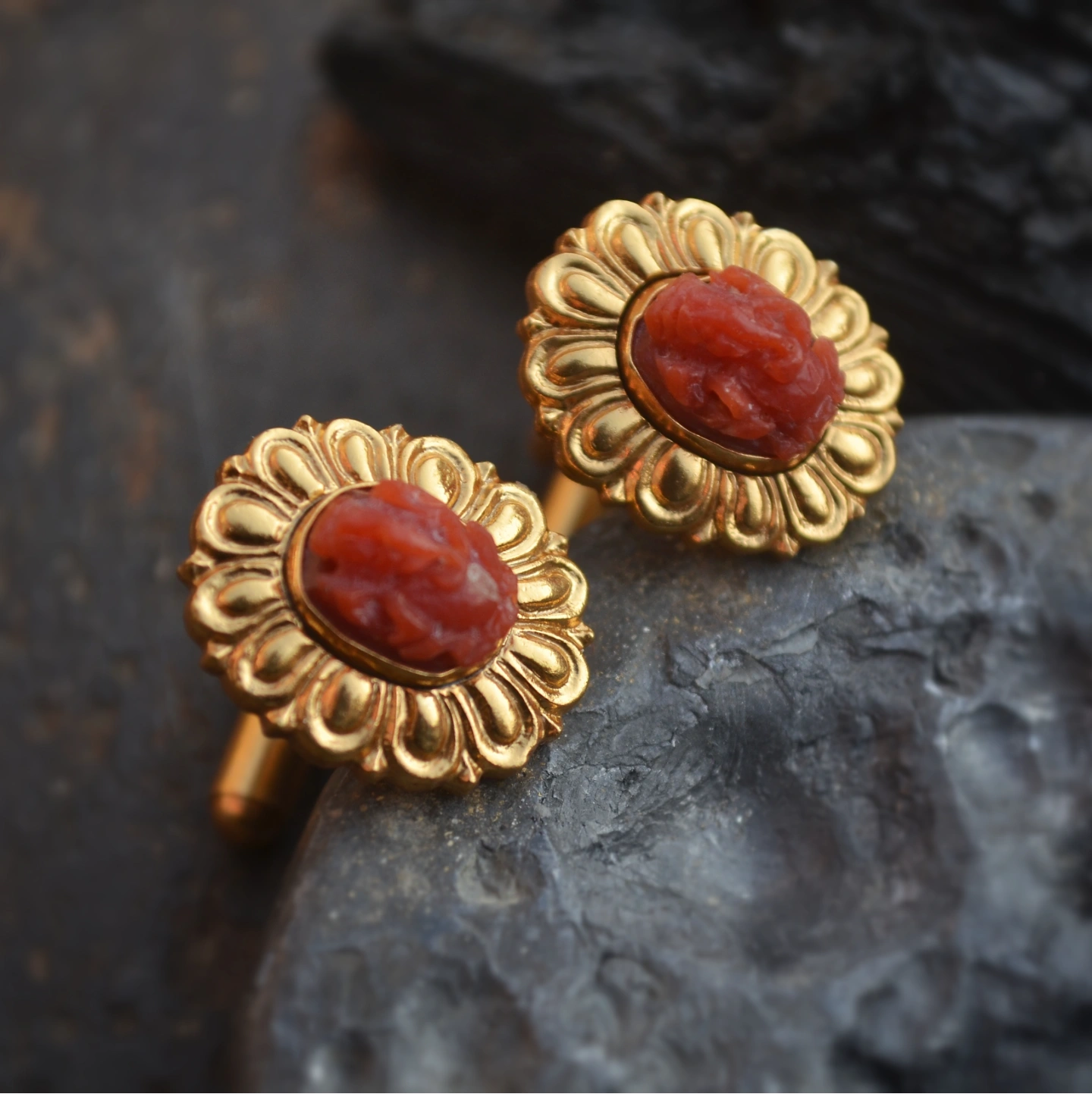 These exquisite gold-toned cufflink feature intricately carved red coral at the center, surrounded by a radiant floral design. Inspired by vintage elegance, the detailed craftsmanship highlights both tradition and luxury. Perfect for festive wear or special occasions, these cufflinks add a bold yet graceful statement to any outfit.