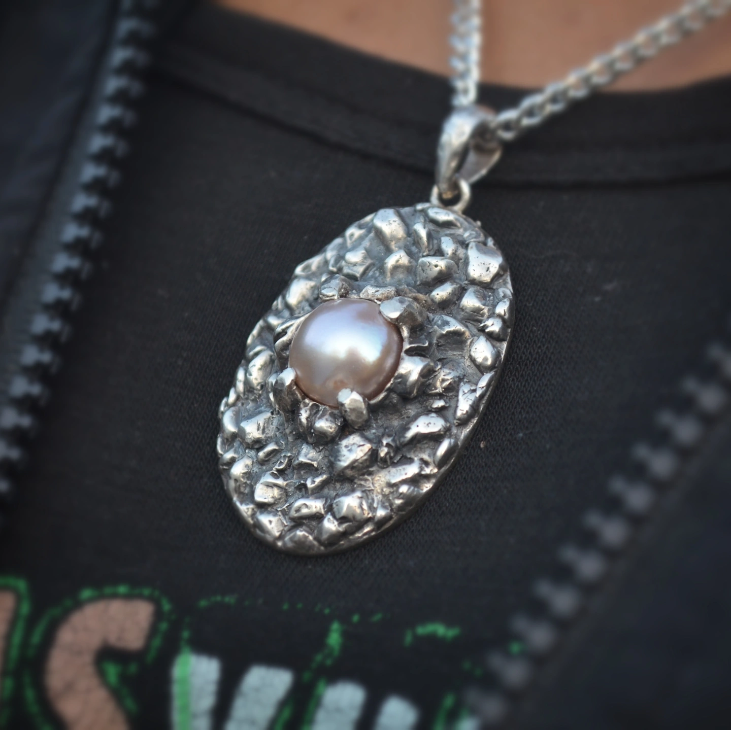 This handcrafted silver pendant features a beautifully set natural pearl at its center, surrounded by a rugged, textured surface that gives it a raw, earthy appeal. The contrast between the smooth pearl and the organic metal finish creates a unique balance of elegance and strength, making it perfect for everyday wear or statement styling.
