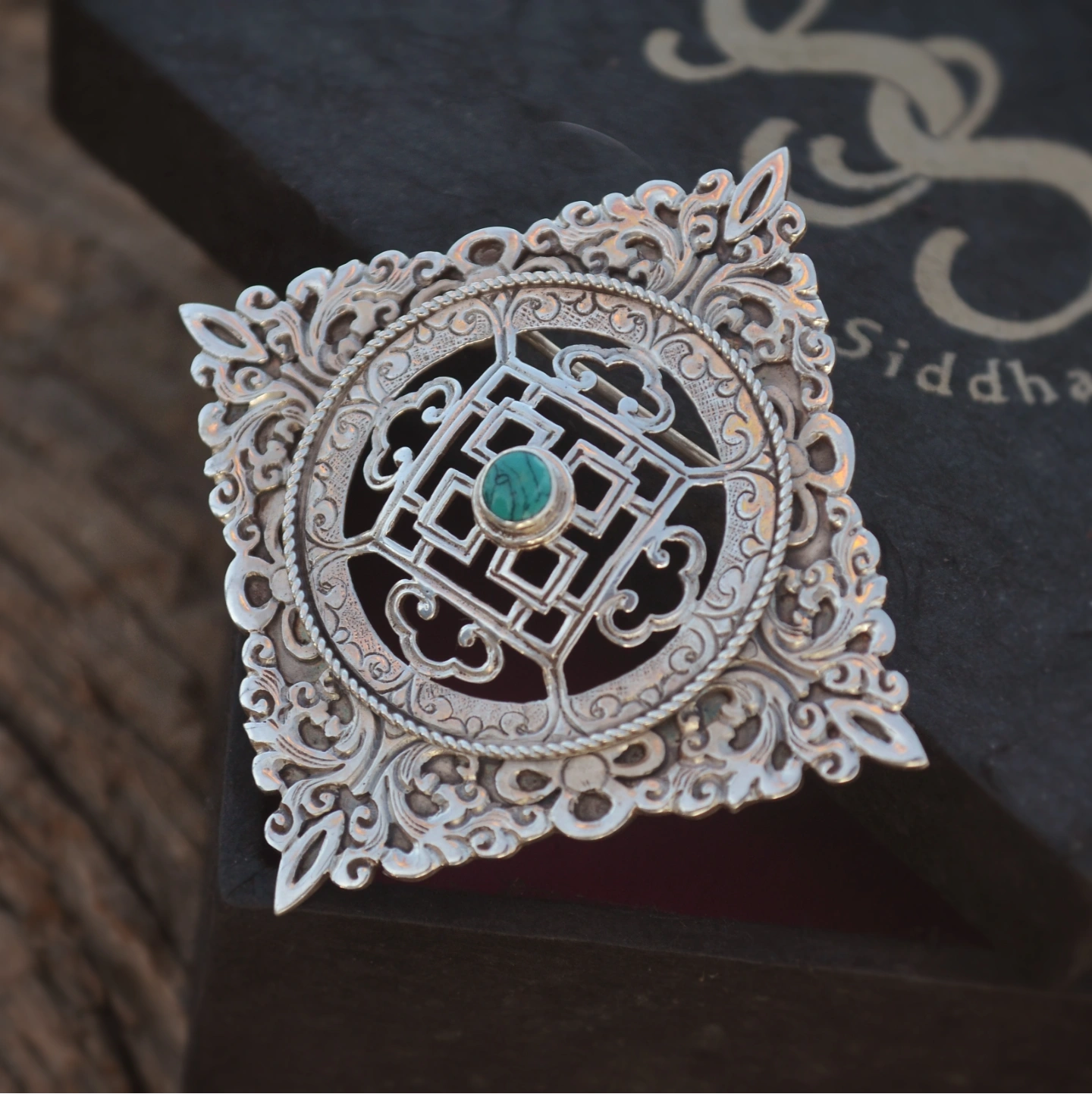 An intricately handcrafted silver brooch featuring a central geometric mandala inspired by spiritual symbolism, highlighted with a turquoise stone at its heart. Surrounded by delicate filigree and traditional motifs, the design reflects harmony, protection, and balance. A timeless statement piece rooted in cultural artistry and fine craftsmanship.