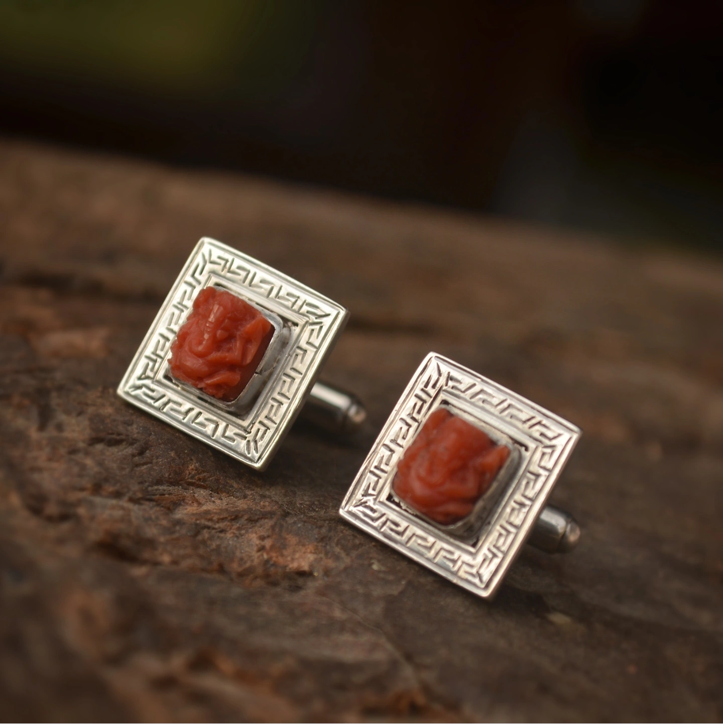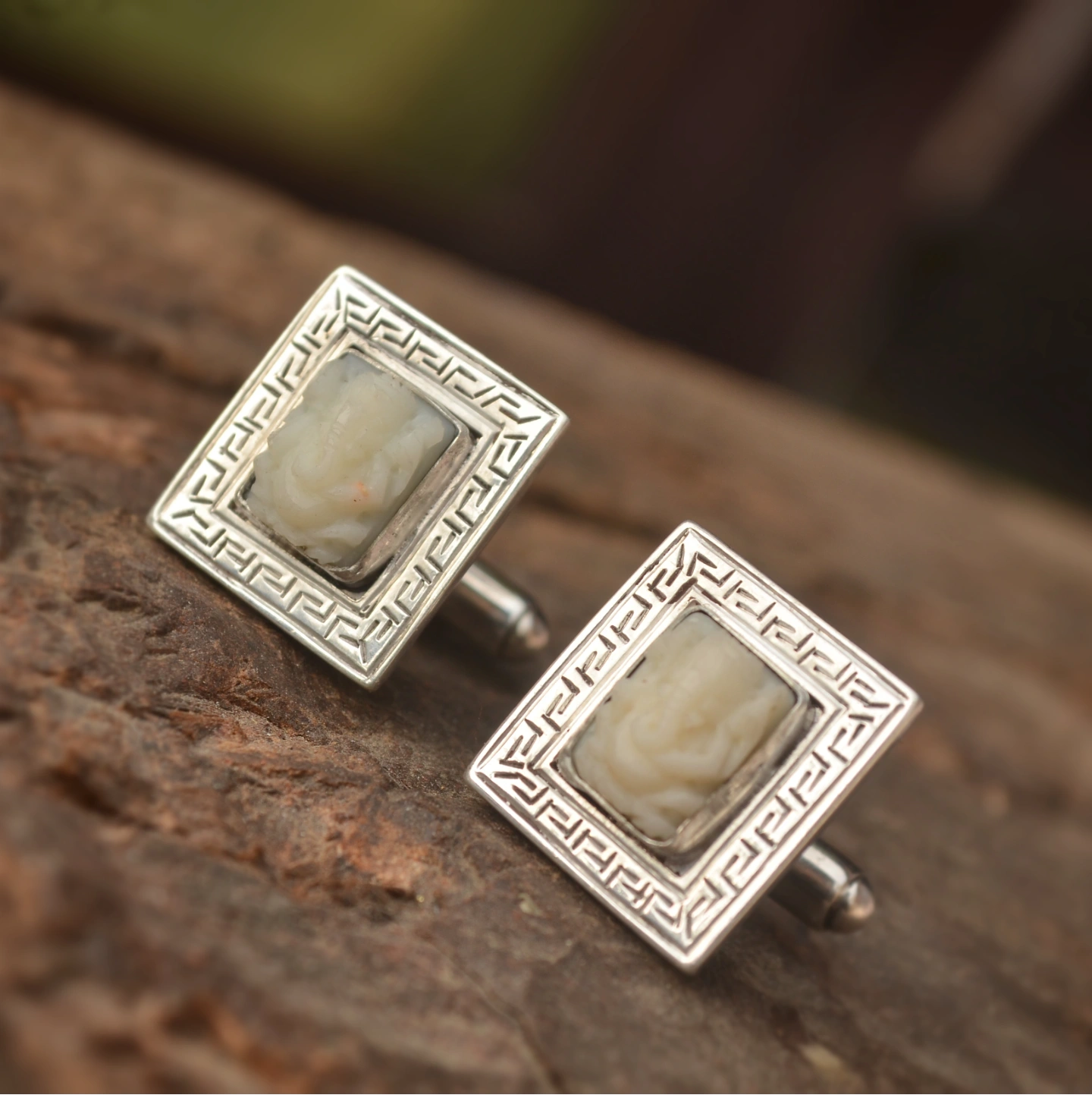 Crafted with detailed artistry, these silver cufflinks showcase delicately carved ivory-toned stones framed by geometric engraved borders. The soft, neutral color gives them a sophisticated and elegant look, ideal for formal occasions or special events. A unique accessory that reflects fine craftsmanship and timeless charm.