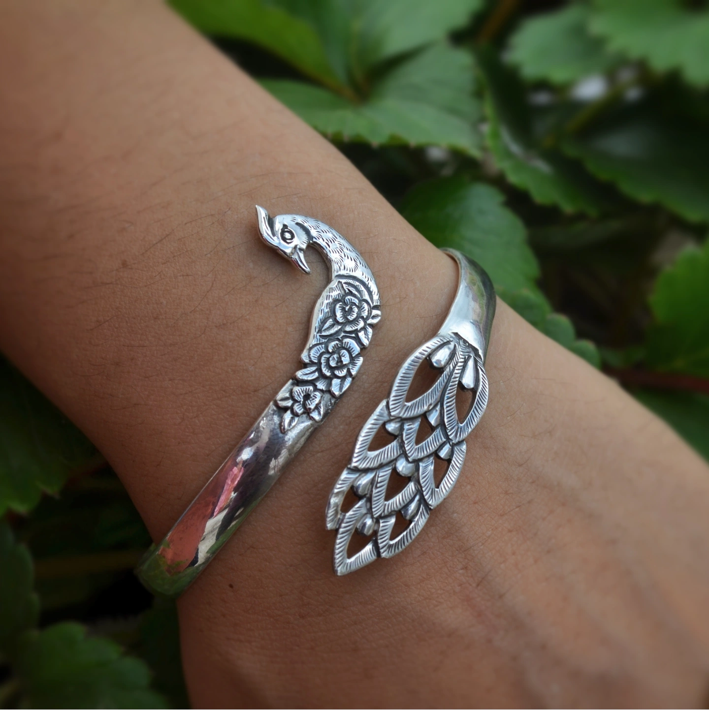 A beautifully handcrafted open silver kada featuring a graceful swan head on one end and an intricately carved floral-feather motif on the other. The design blends elegance and nature-inspired artistry, symbolizing purity and beauty. Lightweight yet bold, it’s perfect for both everyday wear and special occasions.