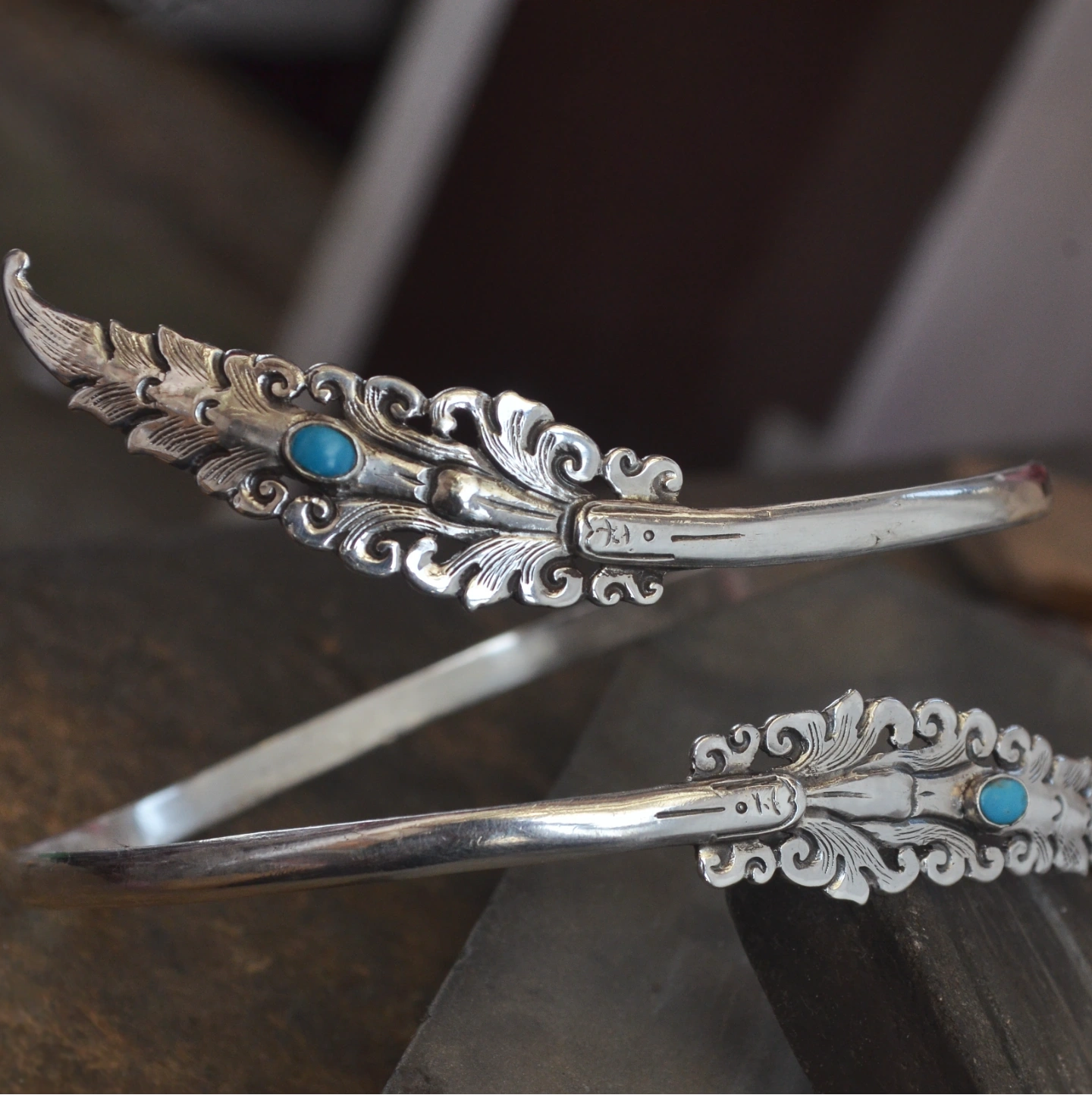 This elegant open cuff bracelet features a beautifully detailed feather-inspired design, accented with a vibrant turquoise stone at its center. Crafted in polished silver with intricate scrollwork, it reflects a blend of traditional artistry and contemporary charm. Lightweight yet eye-catching, this cuff adds a graceful, cultural touch to both everyday wear and special occasions.